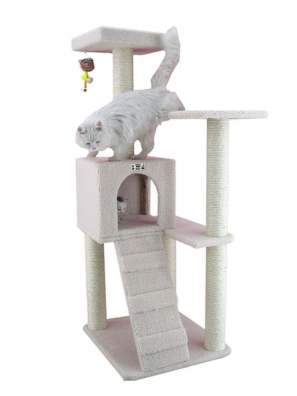 While it’s a little pricey for a basic set-up, the Armarkat 52-Inch Cat Tree is made from pressed wood and covered in faux fleece, which makes it very aesthetically appealing. The ivory color scheme blends nicely into most rooms, so if you’re looking for a simple cat tree that doesn’t clash with your decor, this is a good option.