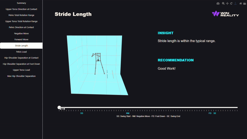 Note: Players biomechanics are evaluated in 12 unique aspects and given a pass/fail grade based on where there is room for improvement. The visualization above shows a passing grade for stride length that is within the typical range; allowing players to get a new perspective on their swing and have real time visual feedback.