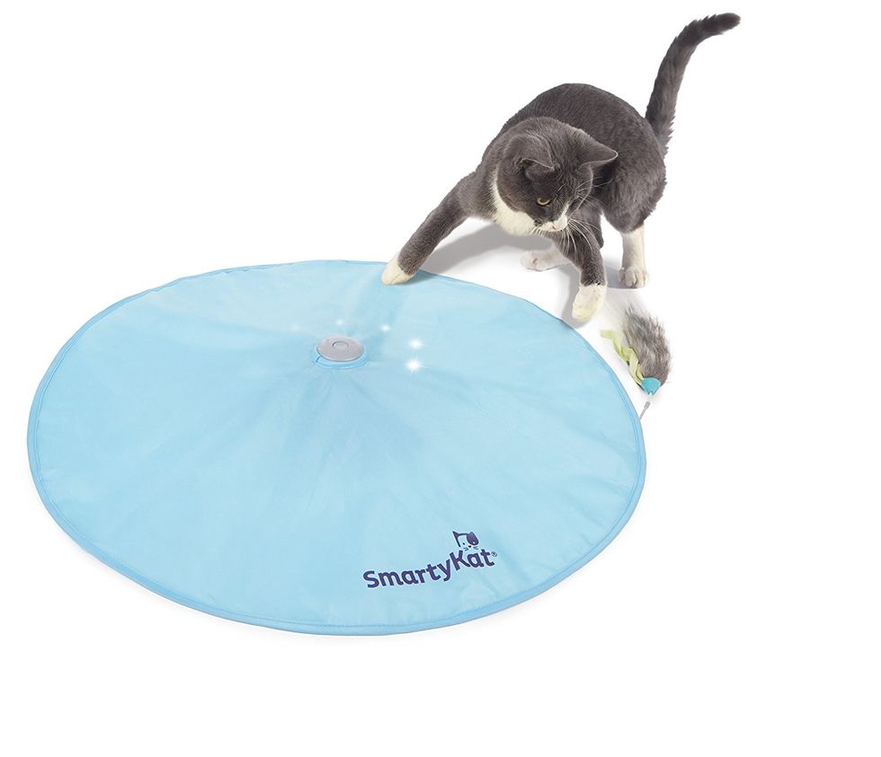 Another toy that plays on predator instincts. The SmartyKat Crazy Cruisers Electronic Chase is a sturdy piece of fabric beneath which an electronic rodent shuffles about. Your cat will pounce all over trying to get it, and you can increase the speed to challenge more active cats.