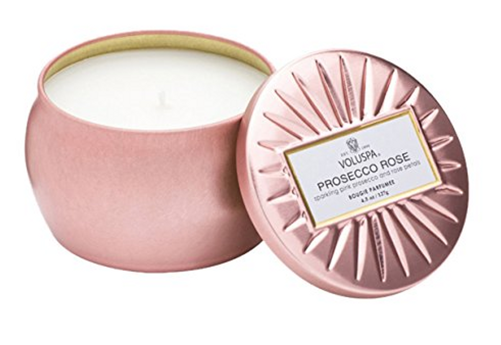 Pretty in pink has never been truer than when you light a match and set your Voluspa Petite Decorative Tin Candle in Prosecco Rose aflame. Notes of sweet sparkling pink Prosecco and fragrant rose petals fill the room with feminine flair, and the lovely 1920’s style tin design adds delicate décor. This 4-oz. candle is dainty, yet makes a substantial statement. Comes in eight additional charming scents including Makassar Ebony & Peach, Bourbon Vanilla, and Aurantia & Blackberry.
