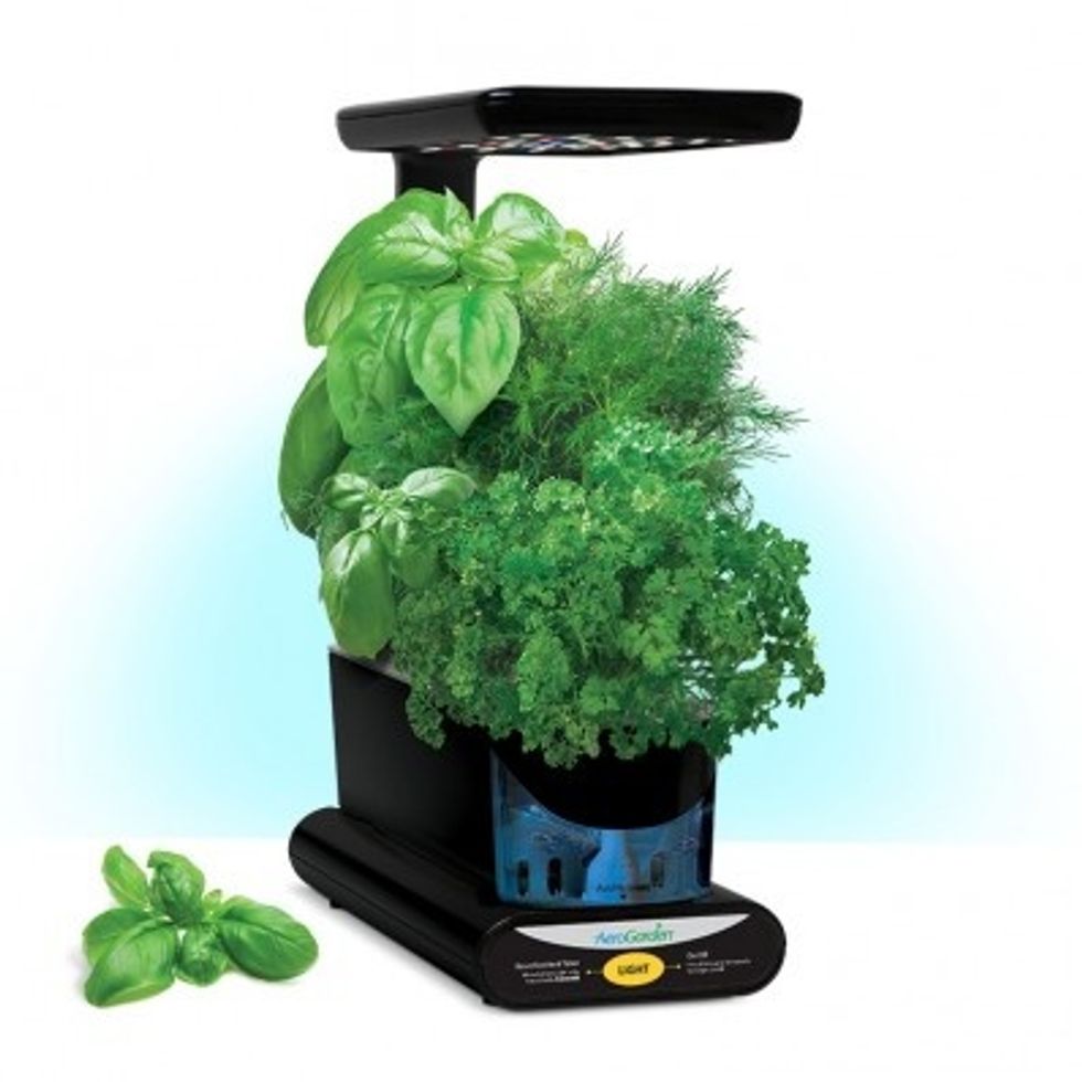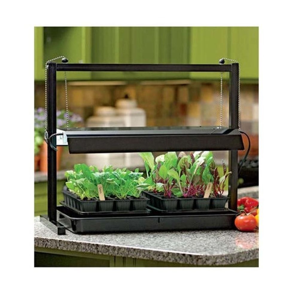 Also try the Compact Tabletop SunLite Garden Stand from Green State Gardener. Its adjustable height and low-profile light make it easy to fit on virtually any available space. You can place your herb seedlings into the watertight plant tray straight from the nursery, and it features an electronic ballast to cut down on the low buzzing sound other indoor herb devices may emit.