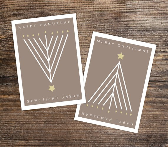 We love this clever, artful card that gives both the menorah and the Christmas tree top billing — it just depends which way you hold it.