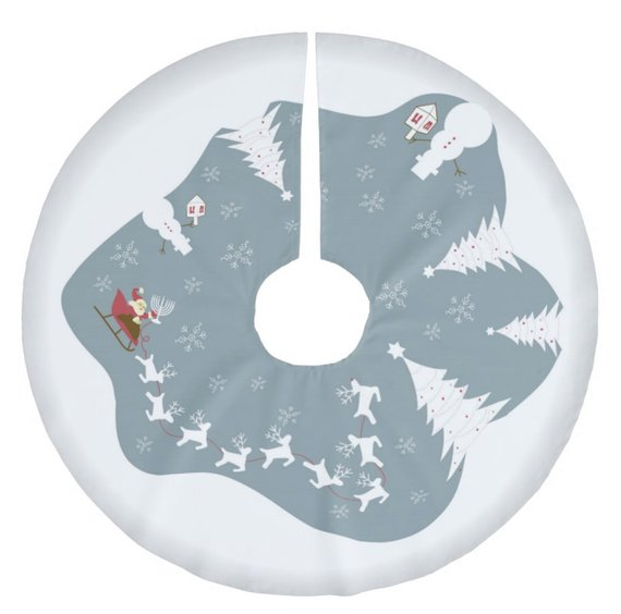 On this interfaith tree skirt, Santa’s holding a menorah and Frosty the Snowman’s ready to give his dreidel a spin.