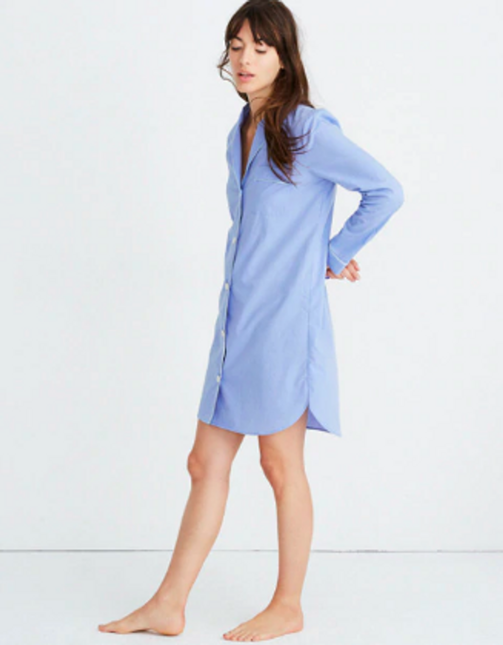This nightshirt from Madewell is comfortable enough to sleep in and cute enough to throw over jeans or leggins and head out the door during the day. It’s made of 100% cotton and comes in a blue peri chambray color with classic white piping around the edges of the hem, sleeves, and chest pocket.