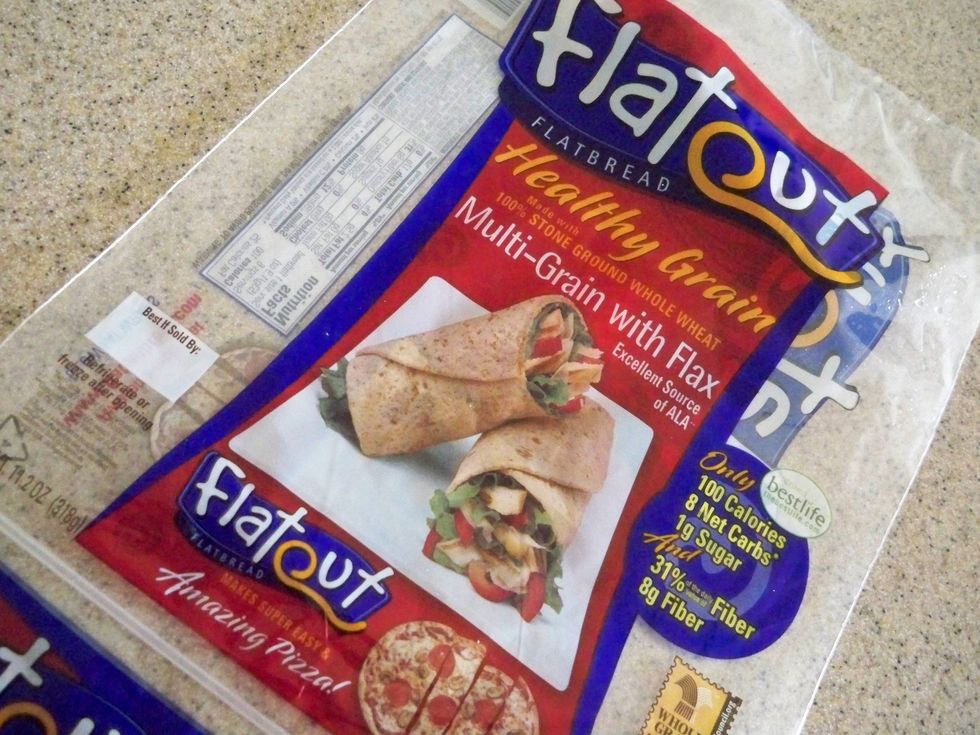 We often order health food products online, like protein powders and bars, so one day I perused the rest of the site we frequent and came across all sorts of low-carb foods, many of which caught my eye (and stomach). Wraps fill a large section of the site, so we ordered a few different flavors of the Flatout brand’s line of products. Flatout is all about health, with lots of “lite” items, gluten-free options, whole wheat offerings, and high-protein/low-carb baked goods.