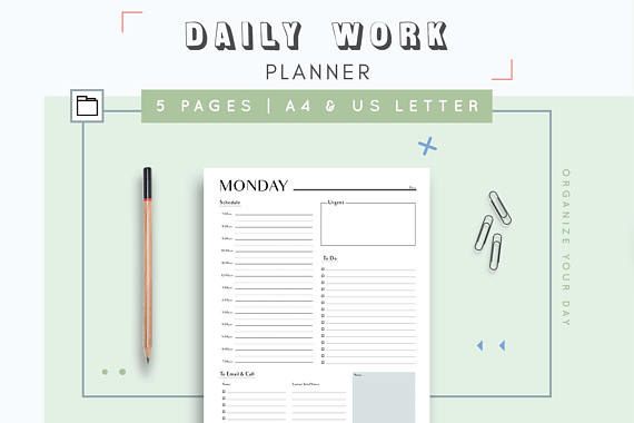 The Daily Work Planner is a printable page set ready for every day of your work week. Each page has a spot for to-dos, a 7 a.m. to 7 p.m. hourly planner (which is also available in military time), and a space for notes. You can print all your pages out in an advance for the year or go day by day. This is just enough granular planning to keep you organized without being too complicated.