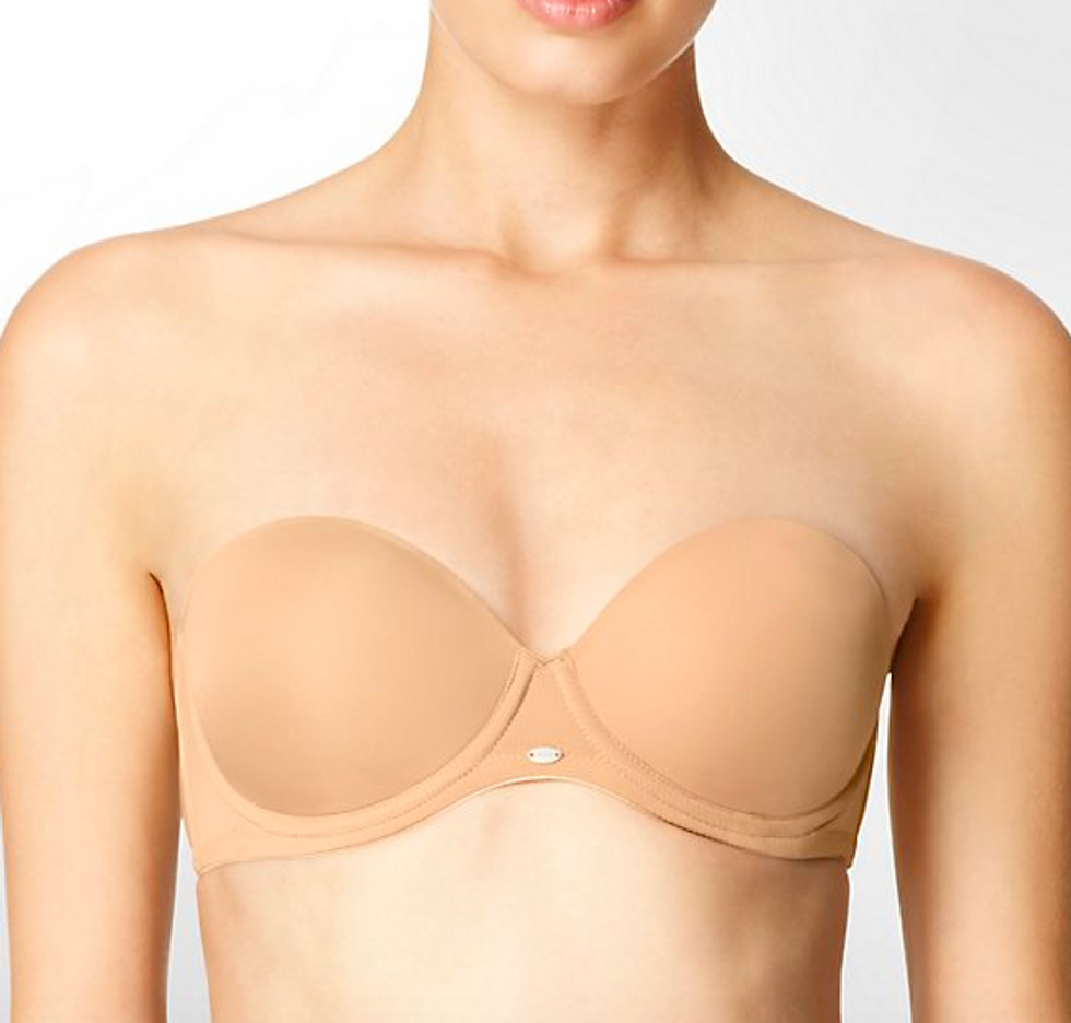This strapless bra is one of Calvin Klein’s best sellers. It’s comfortable, functional, and comes in variety of different “nude” skin tones. With felted underwire and subtle moldable push up padding, it’s best for smaller breasts. Although it does comes in sizes 32A-32DD.