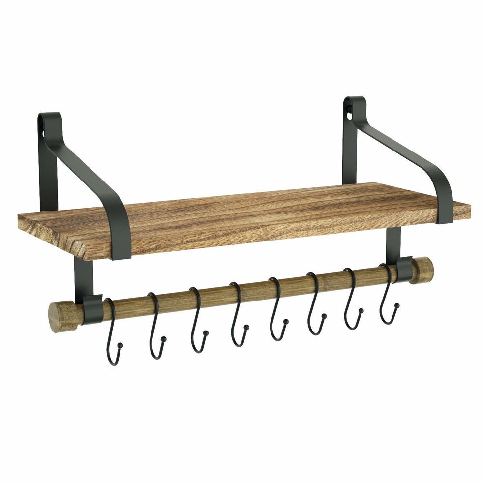 Sometimes the only difference between a stressful kitchen and a relaxing one is organization. Wall racks provide a simple means of organizing commonly-used kitchen essentials, while also providing a neat aesthetic touch. The hooks are great for hanging large utensils like ladles and spatulas, while the shelf affords you some extra storage space.