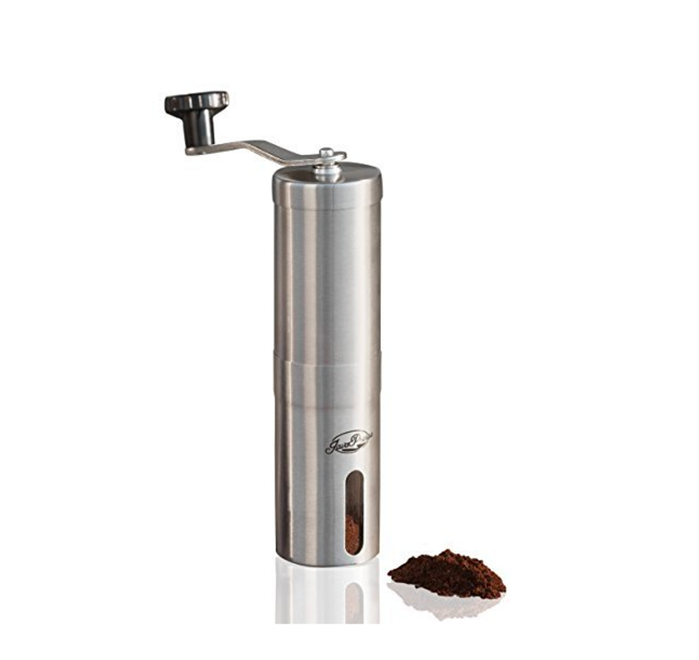 If you’re looking for a more multi-functional device, this spice and coffee grinder does it all. It’s small enough to fit in every kitchen, and takes the manual labor out of grinding coffee beans. You also have the added benefit that it’s designed to grind your nuts, herbs, and spices as well. It’s also priced reasonably. For those who don’t want to manually grind, KRUPS provides a great starter kit.
