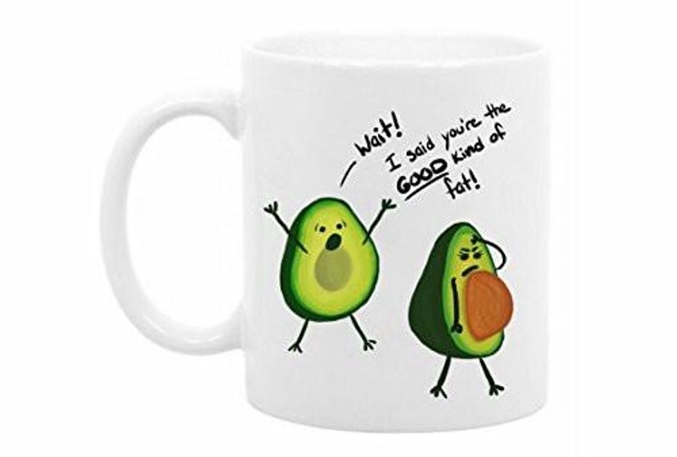 For the avocado lover who is also keen on coffee, Funny Avocado Mug is a fun way to start the day. Poking fun at the, “Does this make me look fat?” no-win question, two cartoon avocados get into it just like we humans do. And it is true… she is the “good kind” of fat! Remember that as you sip your Folgers.