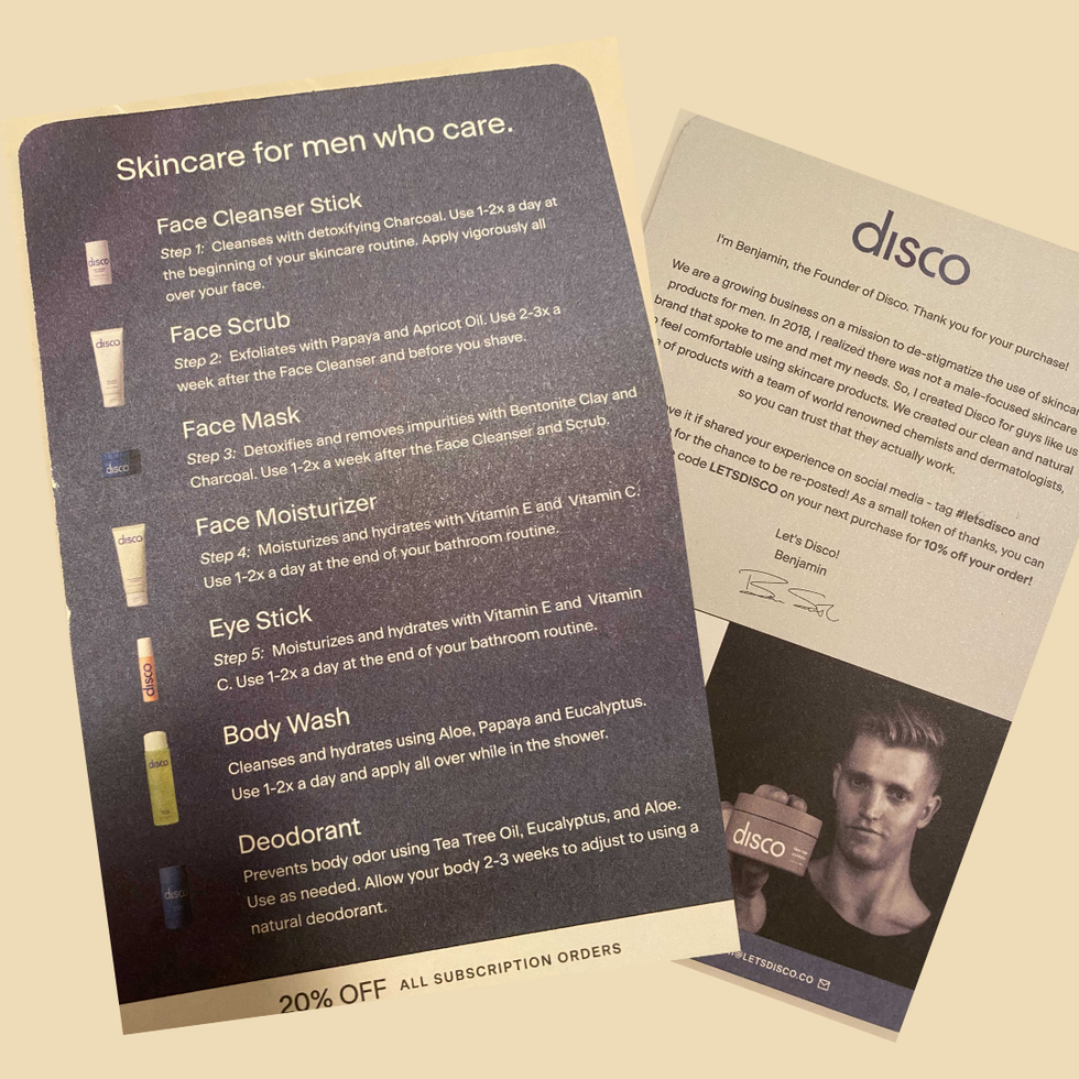 Disco was the first brand I came across that was made to actually address men’s skin issues. Their products looked simple, all-natural, and actually made sense to me. I decided to give it a try and get skincare made by a guy, for a guy AND he explains how to use it ALL: