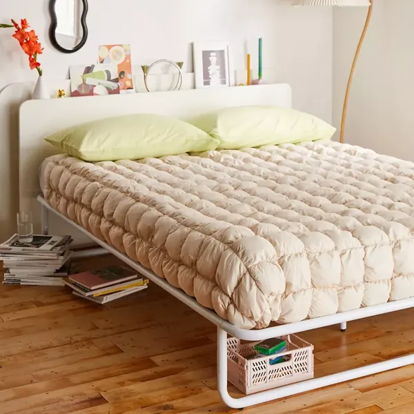 As you enhance your bedroom decor and mattress size, you’ll need to switch out that bed frame. So, don’t invest in a small frame you’ll merely have to replace in a few years. Choose functionality — whether it’s an Amazon frame with under-the-bed storage — or a Floyd bed frame that can grow with you