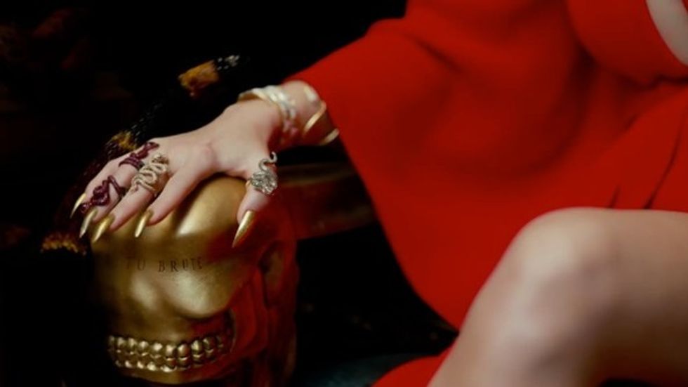 Swift sports gold claw nails in a not-so-subtle dig at her arch-nemesis Kim Kardashian, who’s known for her uber-long nails. Kardashian also famously used the snake emoji to refer to Swift on Twitter, and here bejeweled snake rings are a bold and playful display of self-confidence. Get the look with Nars polish in Milos ($20 from Nars.com).