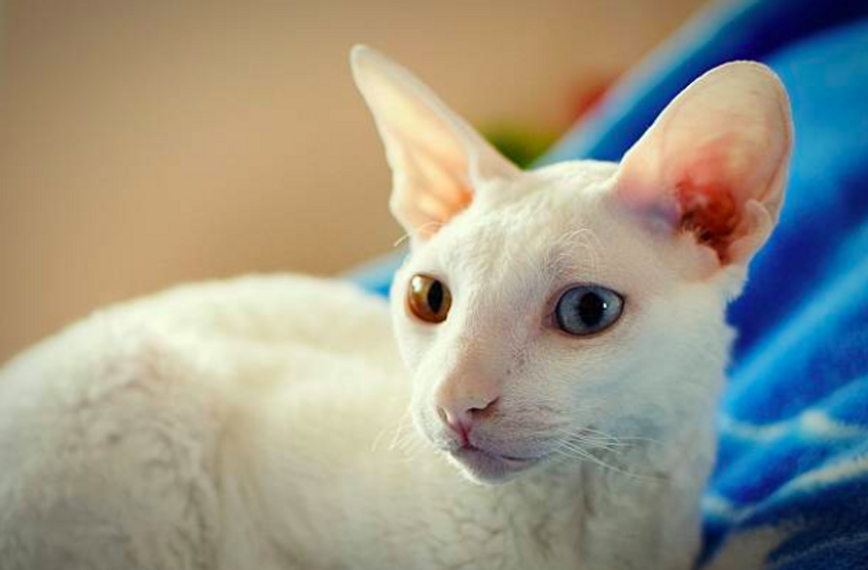 Devon Rex and Cornish Rex both have less fur than other breeds. Their fur is a kind of soft wavy hair. They can be all kinds of colors but all have the distinct large ears, thin faces, and squishy cheeks. The short hair means they get cold easily so they might want a sweater or lay across any heated surface they can find. They are people lovers but definitely know how to entertain themselves with fun and games.