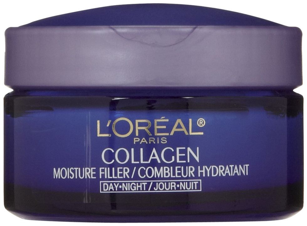 After studying each products’ roster of claims and wide range of price points, I decided on a small tub of L’Oréal Day/Night Collagen Moisturize Filler Daily Moisturizer. Collagen is the structural protein found in skin which breaks down over time. Cosmetic products use a purified form of collagen to replace what our bodies lose as we age. As per Medical News Today, “It forms a scaffold to provide strength and structure.“