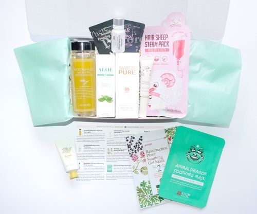 Each box has a similar layout with 6-8 full or deluxe size products, 2 sheet masks, and complimentary samples. The products range greatly so to highlight the selection here is what I got last month in my box; a soothing witch hazel gel, a gel aloe essence, an illuminating powder ampoule, a water based sun gel spf 35, a mascara, a banana blur primer and skin corrector, a dragon sheet mask, a gel sheet mask, and a hair mask. That is a lot of stuff for just one box!