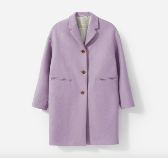 WIth a more voluminous shape, this cocoon coat reminds us of chic, Grace Kelly-1960s-style coats, yet still manages to be thoroughly modern. Double-faced wool lends a thick, luxurious feeling—but are you not sold on that dreamy confection of a lavender color? Dark winter days just got a feminine shot to the heart.