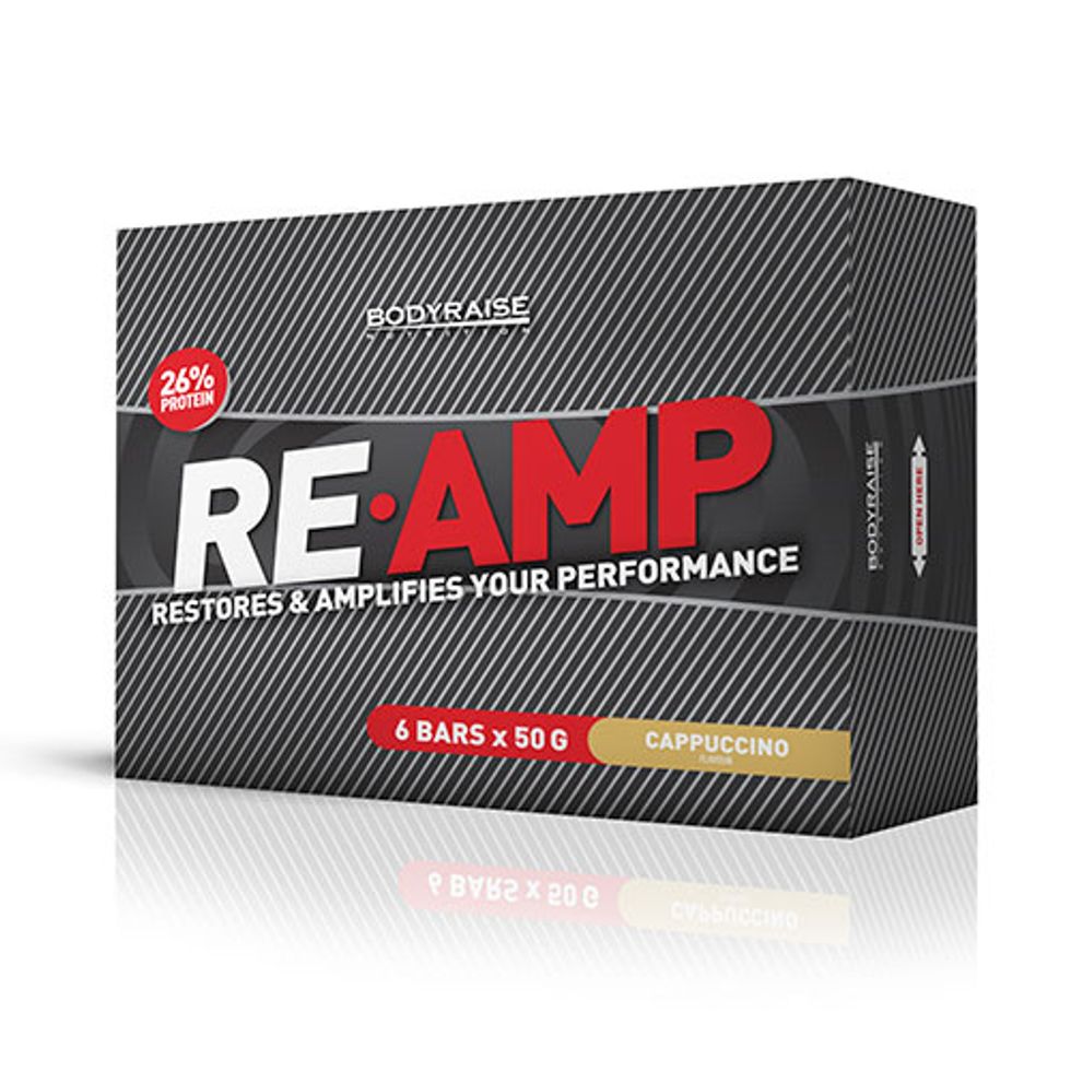 Looking to pack on the muscle with a diet filled with recovery-aiding protein to the max? Reach for Bodyraise Re-Amp for 50g of powerful protein in a delicious cappuccino flavored big-size bar. Get performance-enhancing protein, see increased muscle strength, and fill your belly with close to 400 calories of bodybuilding bar goodness. The chewiness will keep your mouth busy and the cappuccino flavor is a favorite. Amp-up your workout and body with great flavor and function.