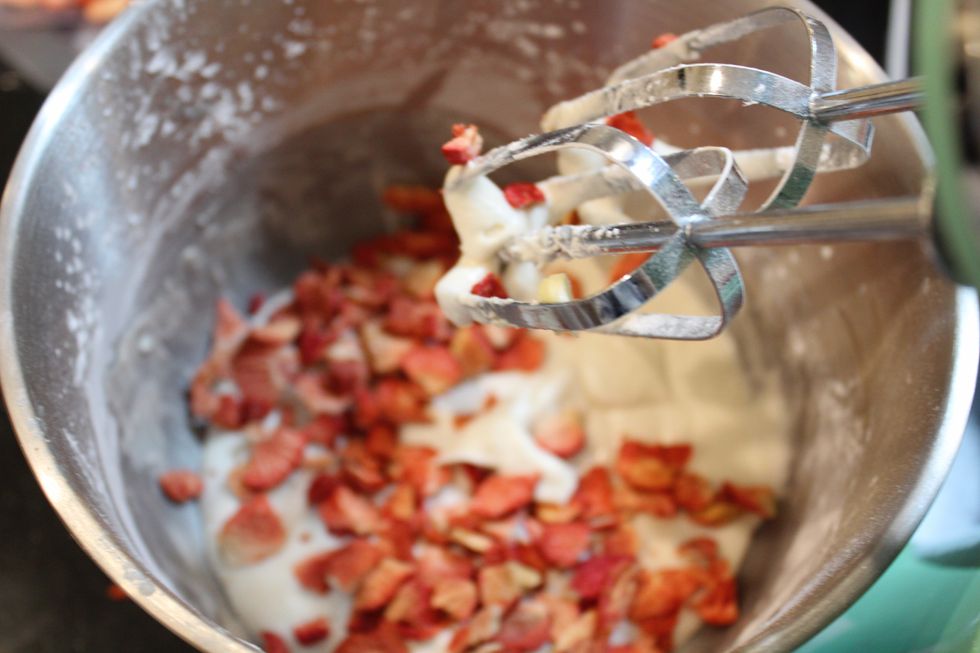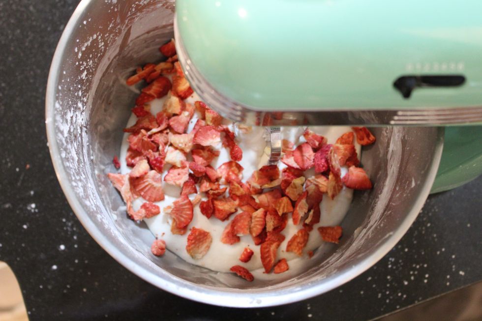 I used Trader Joe’s Cultured Coconut Vanilla Yogurt in my mix, along with a little more butter and their Organic Vanilla Frosting Mix. I put 8 large pieces of freeze dried strawberries aside for garnish, and crushed the rest and added them into the frosting mix to blend together.