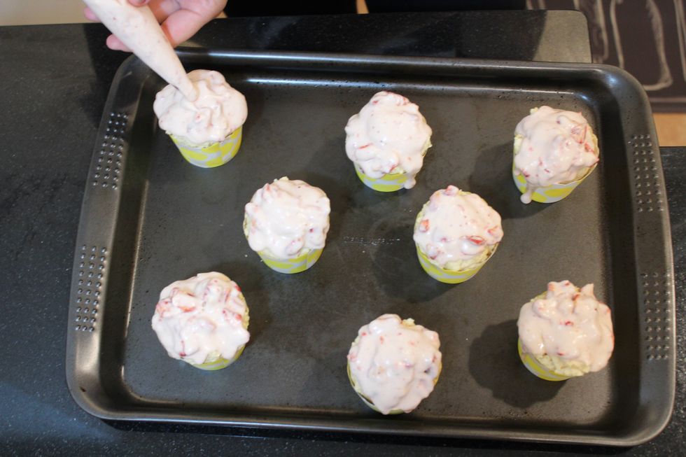When the frosting was properly mixed, I added it into the piping bag, and was just waiting for my shortcake to cool off so that I could frost them! In the meantime, I cut the 4 adorable cocktail straws provided in half, to make 8 for decoration!
