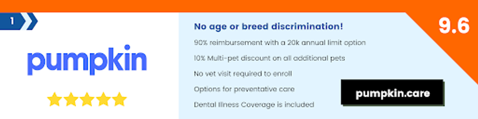 Pumpkin Company Info: Pumpkin Pet Insurance policies do not cover pre-existing conditions. Waiting periods, annual deductible, co-insurance, benefit limits and exclusions may apply. For full terms, visit pumpkin.care/insurancepolicy. Products and rates may vary and are subject to change. Discounts may vary and are subject to change. Pumpkin Insurance Services Inc. (Pumpkin) is a licensed insurance agency, not an insurer. Insurance is underwritten by United States Fire Insurance Company, a Crum & Forster Company and produced by Pumpkin. Pumpkin receives compensation based on the premiums for the insurance policies it sells. For more details visit pumpkin.care/underwriting-information. Pumpkin Preventive Essentials is not an insurance policy. It is offered as an optional add-on non-insurance benefit. Pumpkin is responsible for the product and administration. For full terms, visit pumpkin.care/customer agreement. Pumpkin Preventive Essentials is not available in all states. Paid endorsement – Pumpkin Insurance Services, Inc. is responsible for this advertisement.