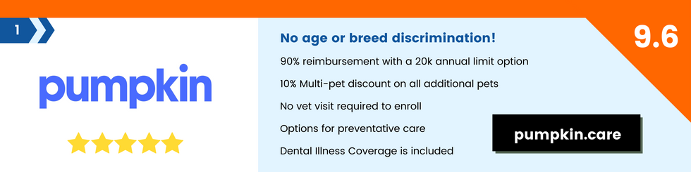 Pumpkin Company Info: Pumpkin Pet Insurance policies do not cover pre-existing conditions. Waiting periods, annual deductible, co-insurance, benefit limits and exclusions may apply. For full terms, visit pumpkin.care/insurancepolicy. Products and rates may vary and are subject to change. Discounts may vary and are subject to change. Pumpkin Insurance Services Inc. (Pumpkin) is a licensed insurance agency, not an insurer. Insurance is underwritten by United States Fire Insurance Company, a Crum & Forster Company and produced by Pumpkin. Pumpkin receives compensation based on the premiums for the insurance policies it sells. For more details visit pumpkin.care/underwriting-information. Pumpkin Preventive Essentials is not an insurance policy. It is offered as an optional add-on non-insurance benefit. Pumpkin is responsible for the product and administration. For full terms, visit pumpkin.care/customer agreement. Pumpkin Preventive Essentials is not available in all states. Paid endorsement – Pumpkin Insurance Services, Inc. is responsible for this advertisement.