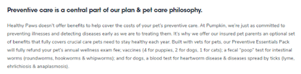 For your pet to live a long and healthy life, preventative care can be the key. Here’s what Pumpkin has to say on their website about their preventative care, vs. Healthy Paws.