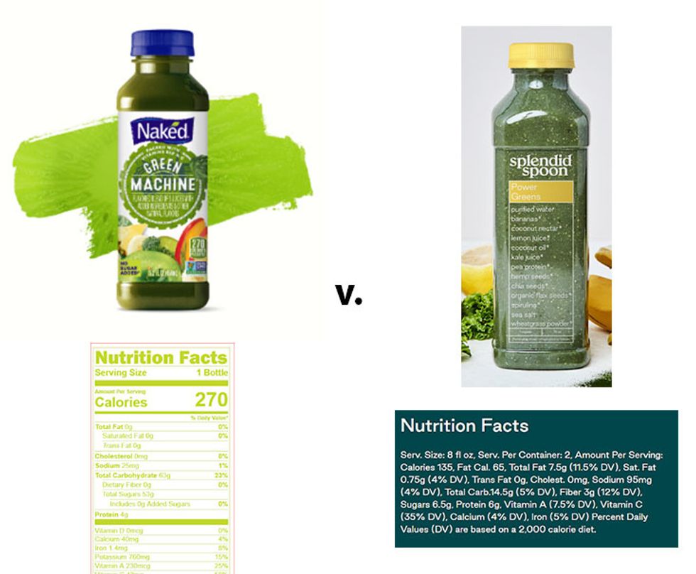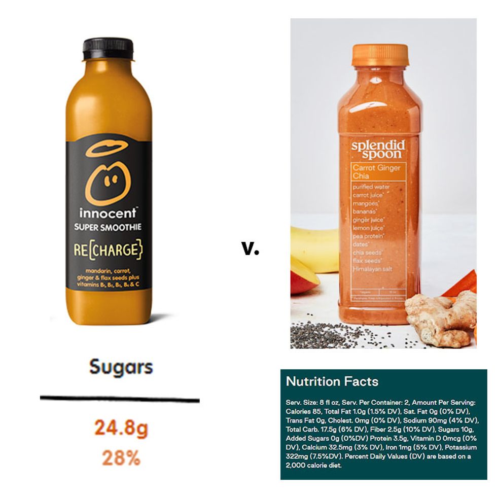 Splendid Spoon was winning against the big smoothie brands, but I wondered if it could measure up to other boutique health-oriented brands. I loved an innocent juice I’d had while I was abroad, so I compared their carrot ginger smoothie to Splendid Spoon’s since the ingredients were so similar. One serving of innocent’s had 24.8g of sugar, 28% of what you need for the day, while Splendid Spoon has only 10g of sugar for the same amount, and it tastes sweeter because of the addition of dates.