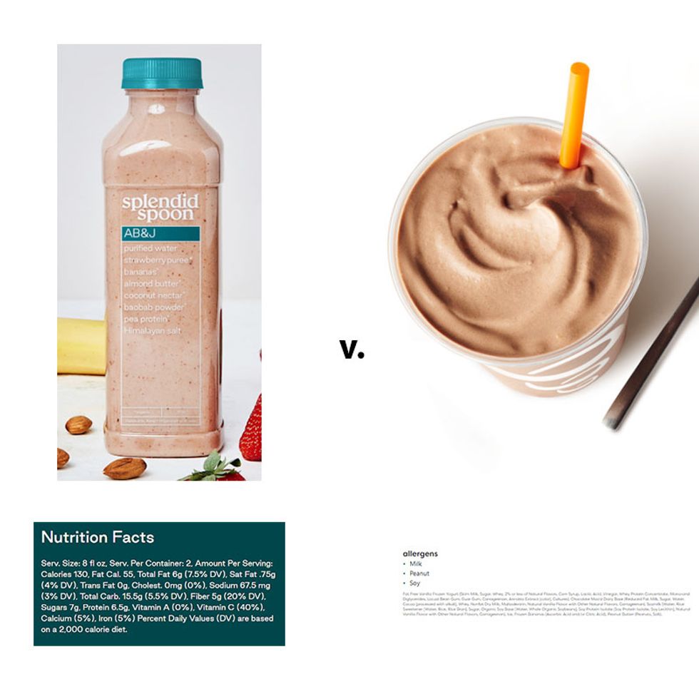 For high protein smoothies, I really love ones that include nut butters. I ate a pb&j every day from ages 10-18, so I craved a grown-up version in my life. I used to get the Peanut Butter Moo’d smoothie from Jamba Juice, as a sugary treat, and now they’ve come out with a healthier version, made with fat-free vanilla frozen yogurt and soymilk! The dairy makes it super delicious and creamy, but with 63g of sugar in 16 ounces, it’s still a dessert. Also, my favorite food in the world, pb&j, is vegan, so I’d prefer a vegan version. The use of almond butter and pea protein in Splendid Spoon’s ab&j makes it incredibly filling, with only 14g of sugar in the same amount.