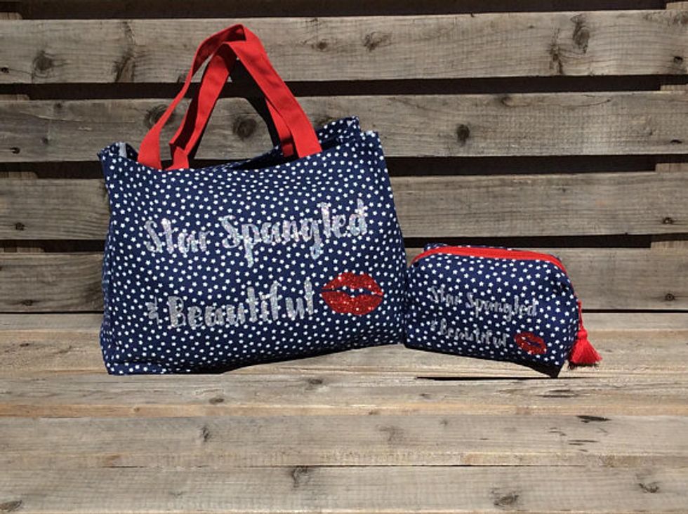 Carry all your essentials (and then some) in your “Star Spangled Beautiful” 4th of July canvas tote with matching makeup bag from ChrisiesCollection. The red, white, and blue “blinged-out” bags are emblazoned with silver and red glitter and a set of luscious lips to top off your summery look with a kiss. While these bags are perfect for the fourth, you are “star spangled beautiful” all year long, so use these canvas carry-alls whenever you are feeling festive.