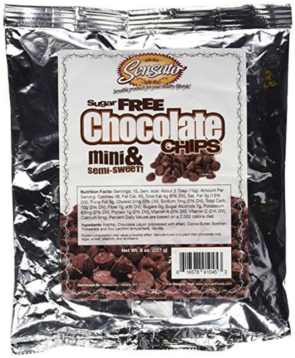 What’s a chocoholic to do, aside from giving in to temptation and becoming a human Cookie Monster? What if I told you that you can crave chocolate and eat it too, without the guilt and without the extra padding? Yes, your chocolate fantasies are about to come true, thanks to Sensato sugar-free mini semi-sweet chocolate chips. Sweetened with maltitol rather than sugar, these low-carb chocolate bits will only set you back 58 calories per 2 tablespoon serving and you’ll never know that they are not the real deal.