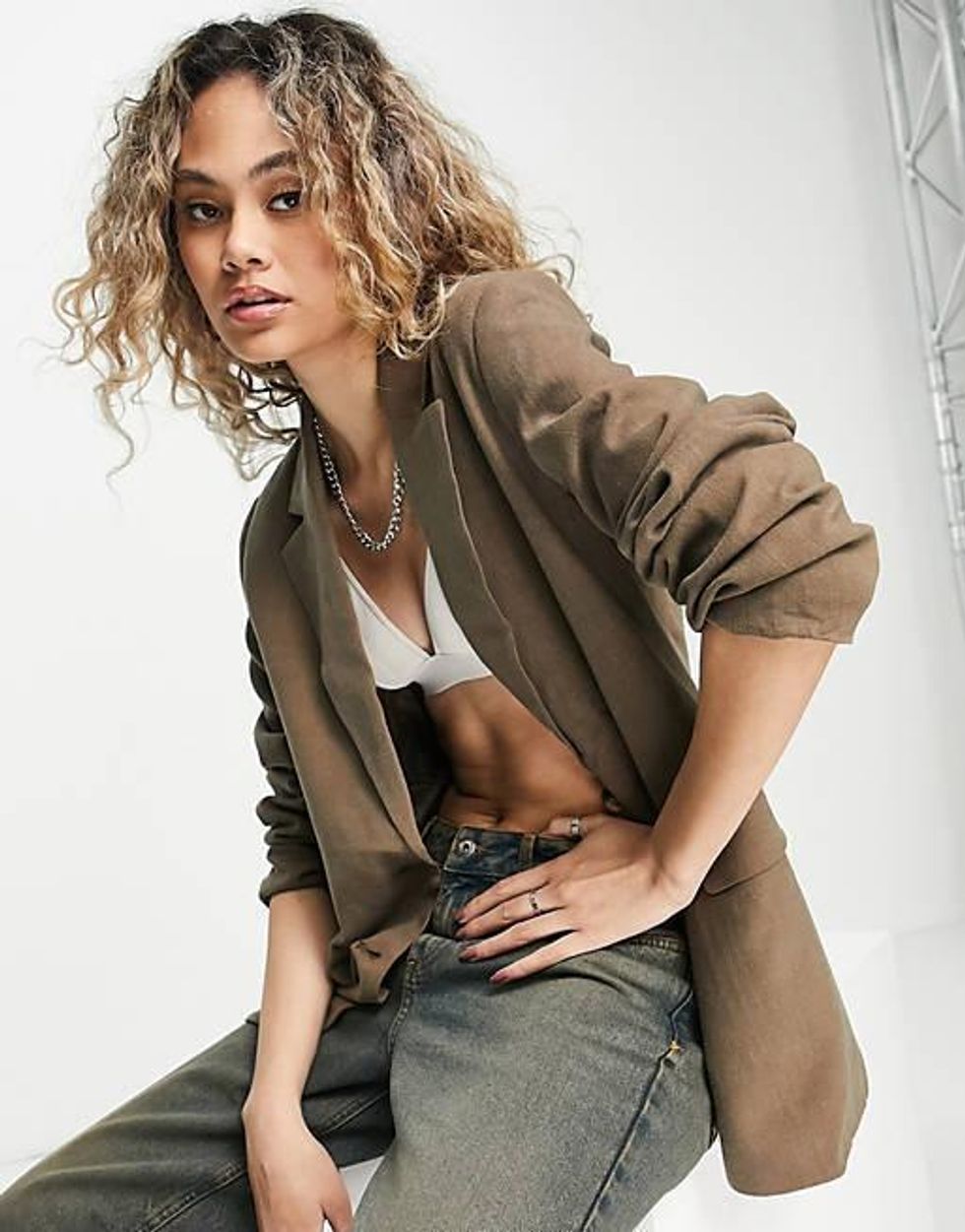 If jeans are too heavy for you, a pair of tailored pants will give you the same elevated look with a little bit of added sophistication. While you may associate these with a work environment, menswear pants look great with crop tops, high neck bodysuits, and bra tops alike.