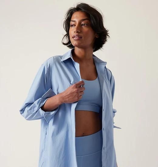 I like to wear this oversized button down from Athleta over a crop top on the weekends and fully buttoned with a pair of corduroys on the weekdays. It’s great even layer under a sweater or on its own.