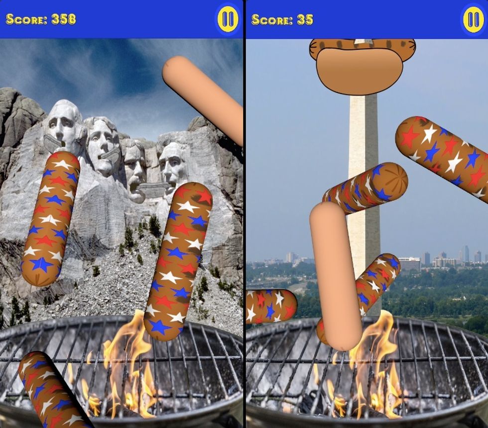 Curtis explains that Smith is the “real programmer.” She, on the other hand, is still learning and could do some things, like create hot dogs on fire, but Smith did most of the coding while she stuck to graphics. Speaking of graphics, the park scene I mentioned before isn’t the only place you can grill dogs on Wiener Tapper. There are a myriad of locations for hot dog-flinging fun, like on an airplane, at a nursing home, and even in front of national monuments. Curtis explained, “friends of ours contributed ideas for the different backgrounds, which ended up being the most fun part of the whole project for me. We’re about to release the first themed mode for the 4th of July, and photoshopping hot dogs onto Mt. Rushmore was one of the highlights so far. And the other patriotic backgrounds, but I’ll let those be a surprise.”